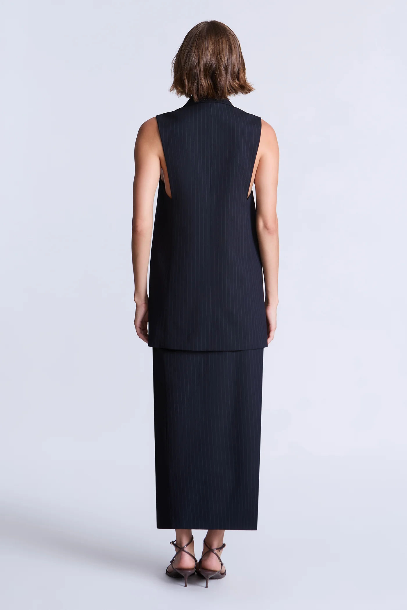 Pinstripe midi skirt defined by clean, architectural lines and subtle directional seaming for quiet dimension. Tailored to sit smooth through the waist with a streamlined drape. A sharp foundation piece for office polish, gallery days, or after-dark styling.